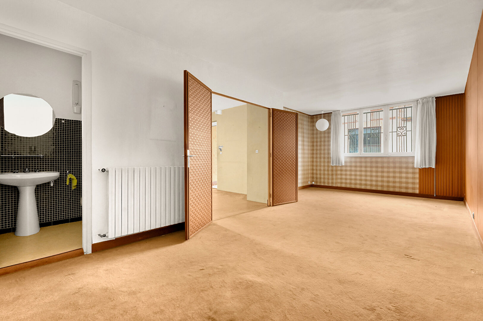 Retour sur l'entrée et l'escalier menant vers l'étage et sa belle hauteur sous plafond avec aujourd'hui un séjour de 25m² climatisé , une cuisine de 12m² ouvrable pour une surface potentielle de 37m².