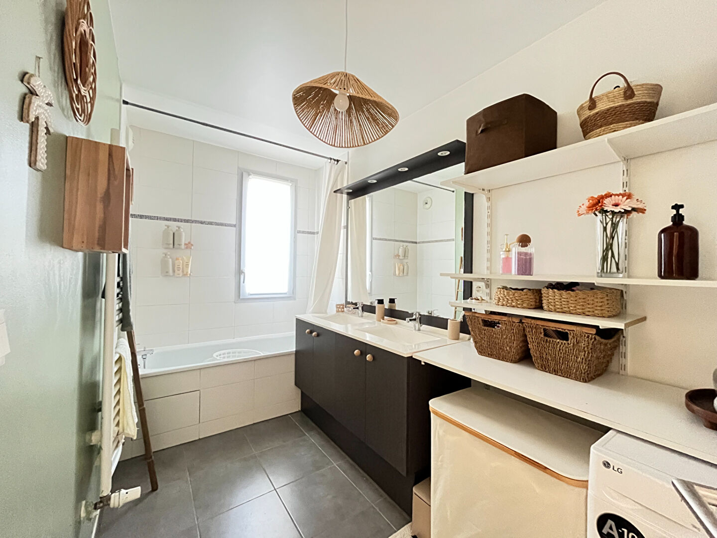Une grand garage attenant de 20m² et une place de parking aérienne devant.