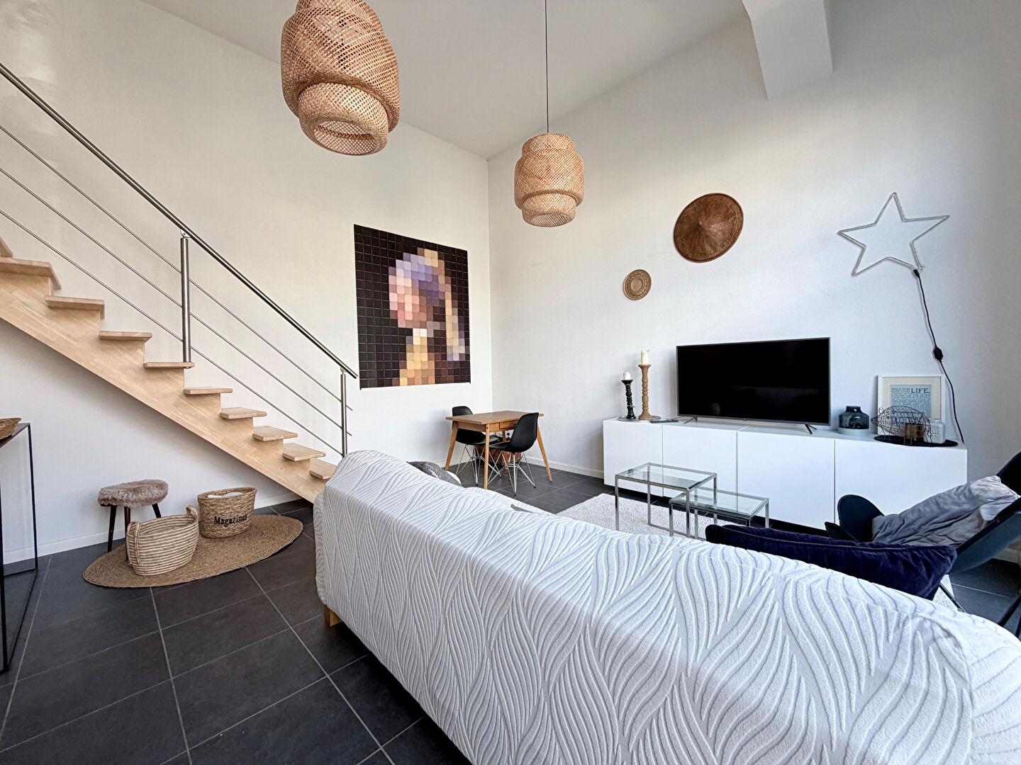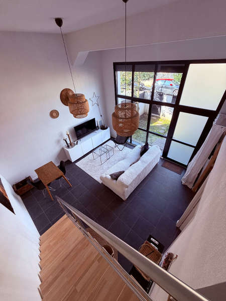 Il offre un cadre de vie paisible et confortable avec de beaux volumes. Il se compose d'une chambre, à l'étage, Au rdc un séjour lumineux de 24 m² exposé à l'est, d'une cuisine aménagée et équipée, d'une salle d'eau ainsi que d'un WC séparés. Le chauffage est assuré par un système d'air pulsé avec climatisation réversible, garantissant un confort optimal en toutes saisons. Les fenêtres en aluminium double vitrage et les volets métalliques électriques contribuent à l'isolation thermique et phonique, renforçant le calme de l'appartement.