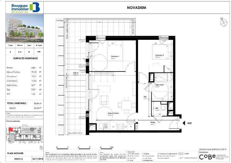 Situé au 2ème étage d'une résidence neuve sécurisée, découvrez un T3 fonctionnel de 59.50m² composé d'une entrée, d'un séjour avec cuisine ouverte équipée, un balcon, 2 chambres , belle terrasse de 25.63m². Une place de parking sous-sol complète ce bien. L'eau chaude et le chauffage collectifs sont inclus dans les charges tout comme la taxe d'enlèvement d'ordures ménagères.
