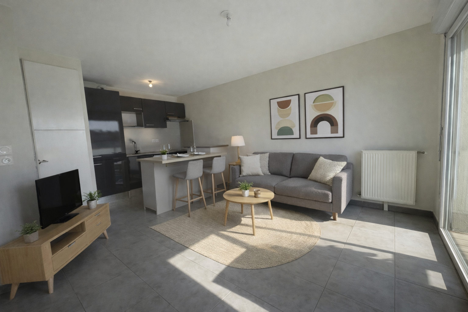 un séjour avec cuisine ouverte de 18 m² donnant sur un balcon de 6,9 m² exposé Sud-Est,